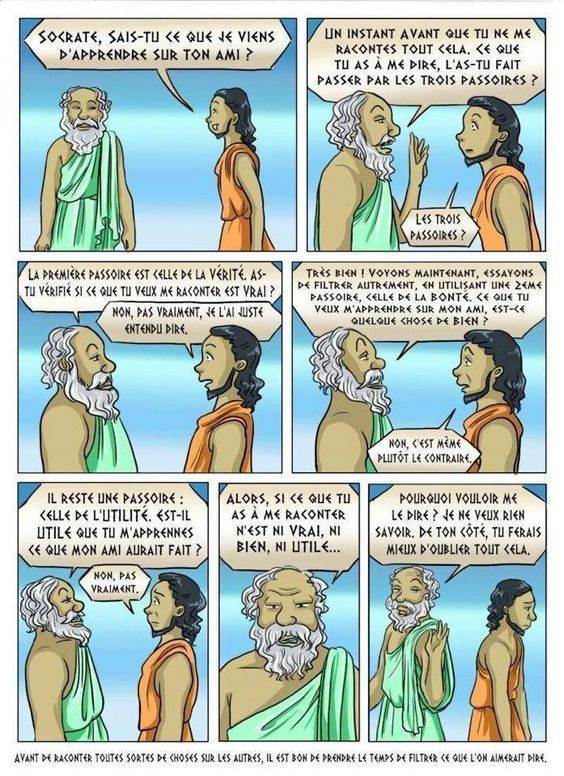 « Mais oui, reprit Socrate. Avant de me raconter toutes sortes de choses sur les autres, il est bon de prendre le temps de filtrer ce que l'on aimerait dire.