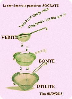 - « Essayons de filtrer autrement  en utilisant une deuxième passoire, celle de la bonté. Ce que tu veux m'apprendre sur mon ami, est ce quelque chose de bon? »