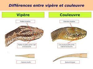 Les vipères ont une tête plutôt triangulaire (la couleuvre a une tête arrondie), et sa morsure laisse deux trous caractéristiques, dus aux crochets.