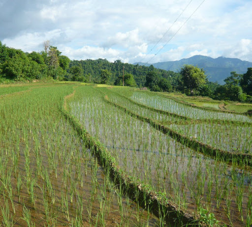 Les flancs des collines sont couverts d'une mosaïque de rizières en terrasses retenues par de petits talus de terre.