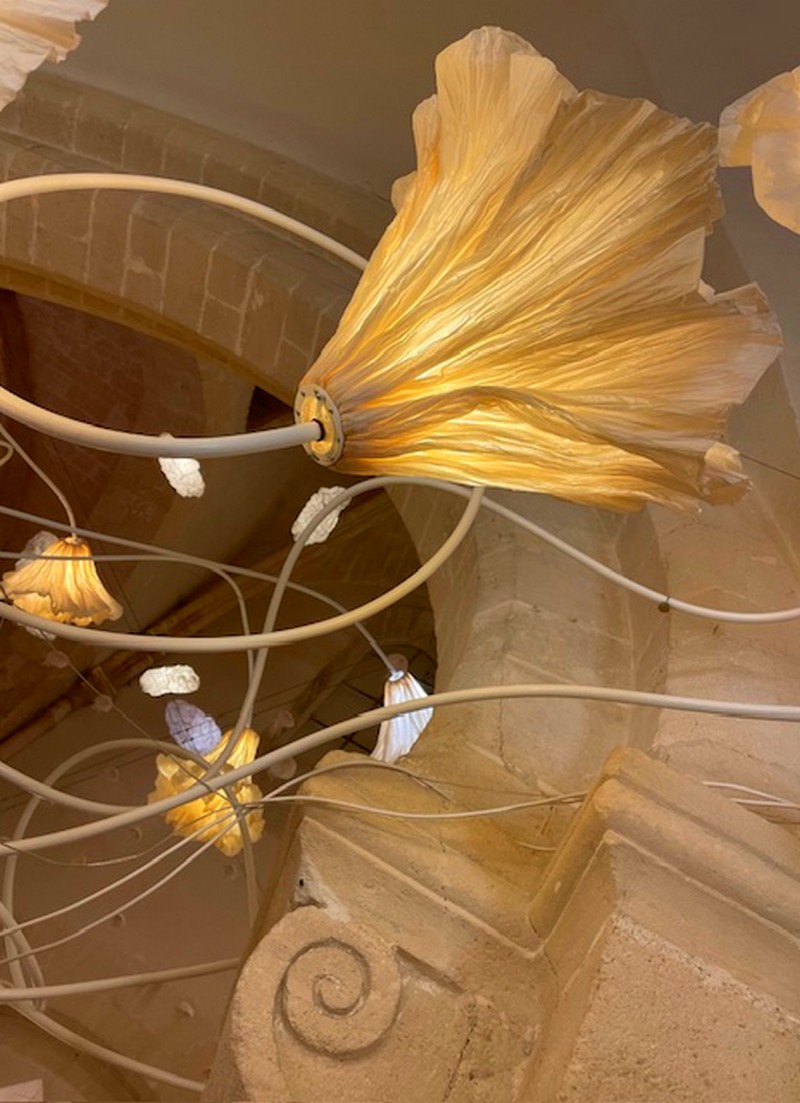 «Je suis Parisien, dit-il. J’aime sortir du cadre des galeries. Ce lieu est atypique, le cadre superbe…» Junior Fritz Jacquet fait de l’origami géant : casques, végétaux, statues, tableaux et tentures en relief… vont investir cette ancienne église, reconvertie en salle d’exposition.