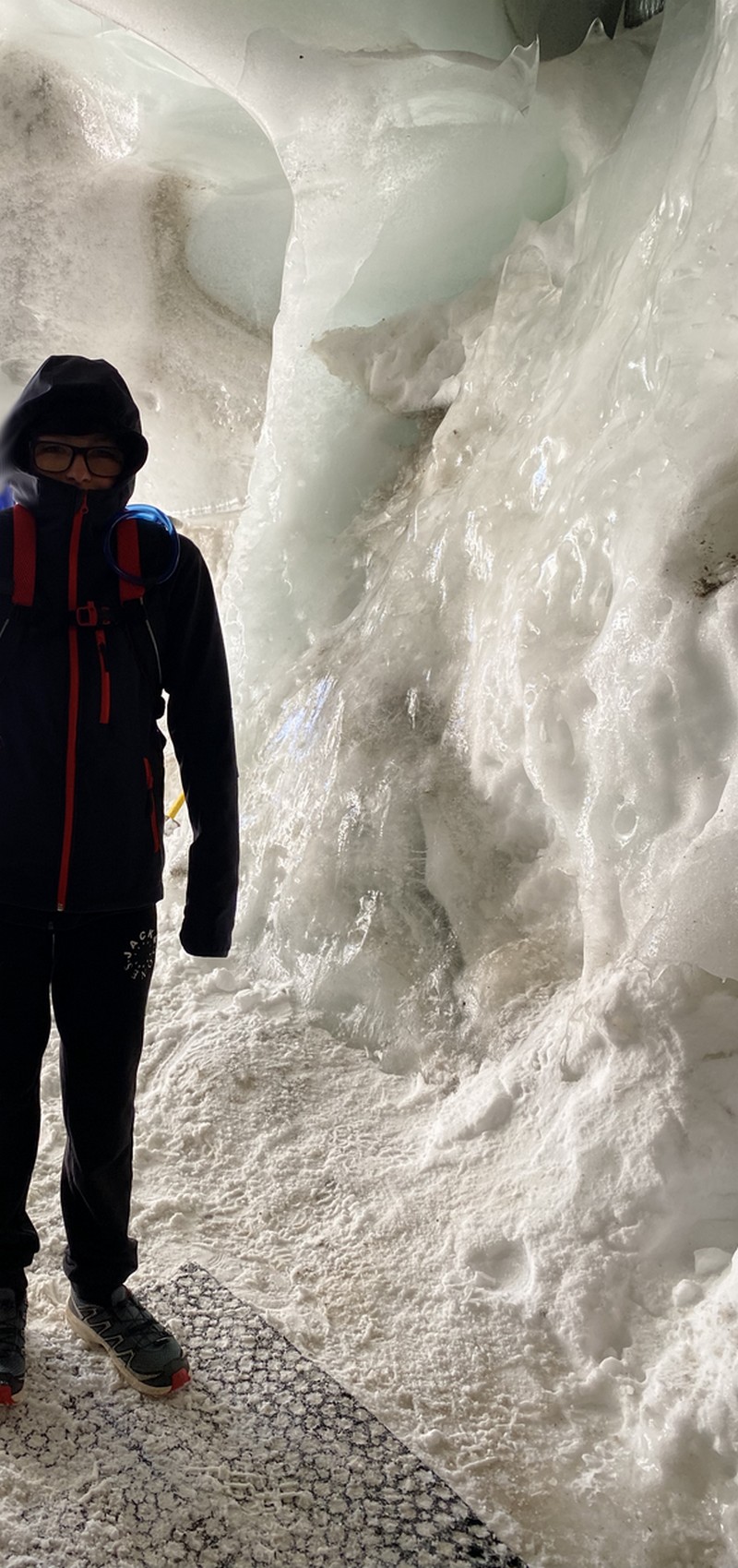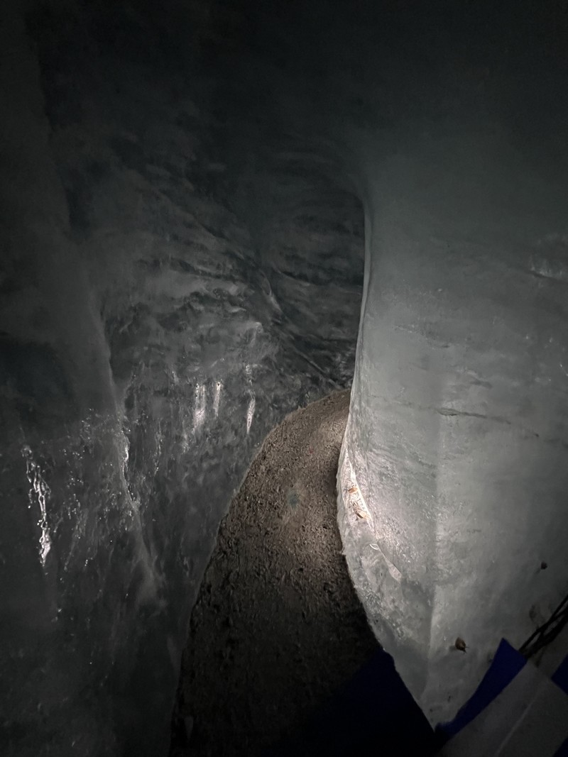 La grotte doit être creusée chaque été car le glacier se déplace d'environ 70 m chaque année.