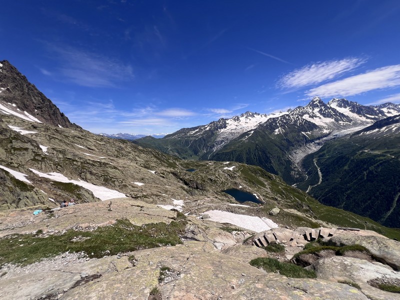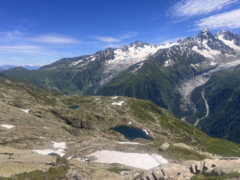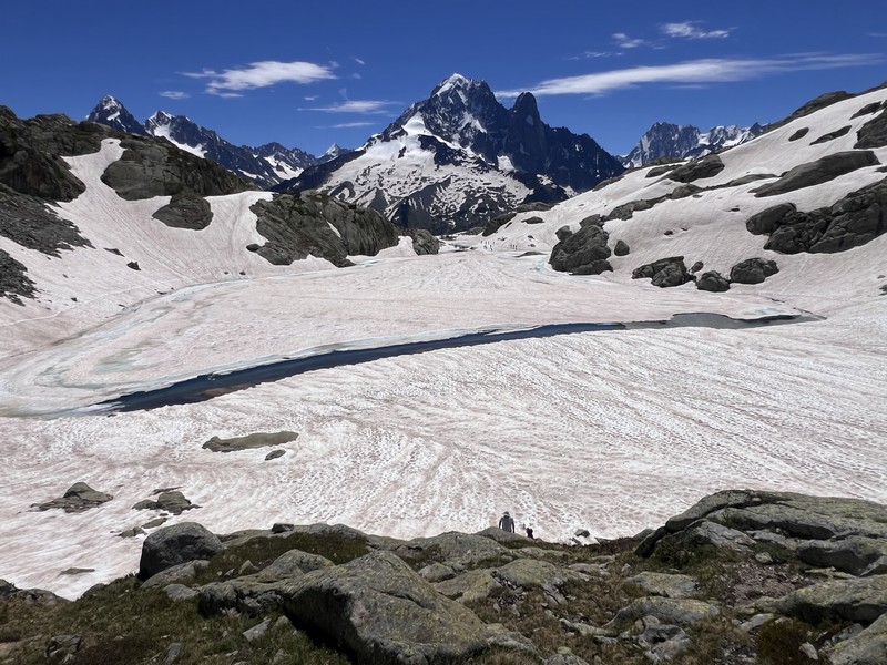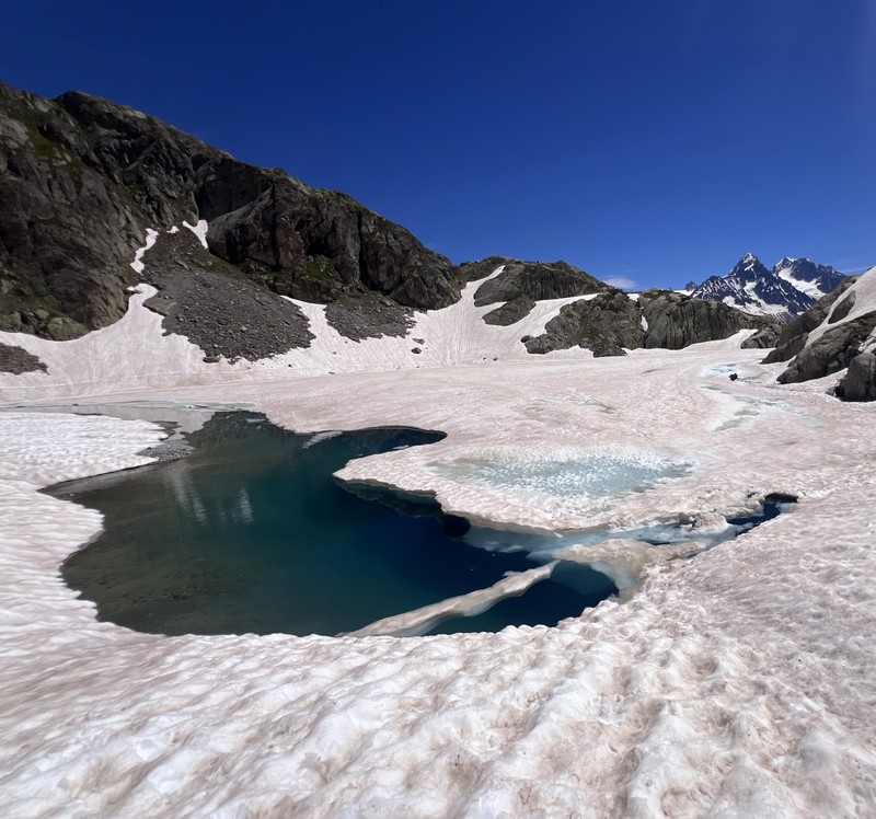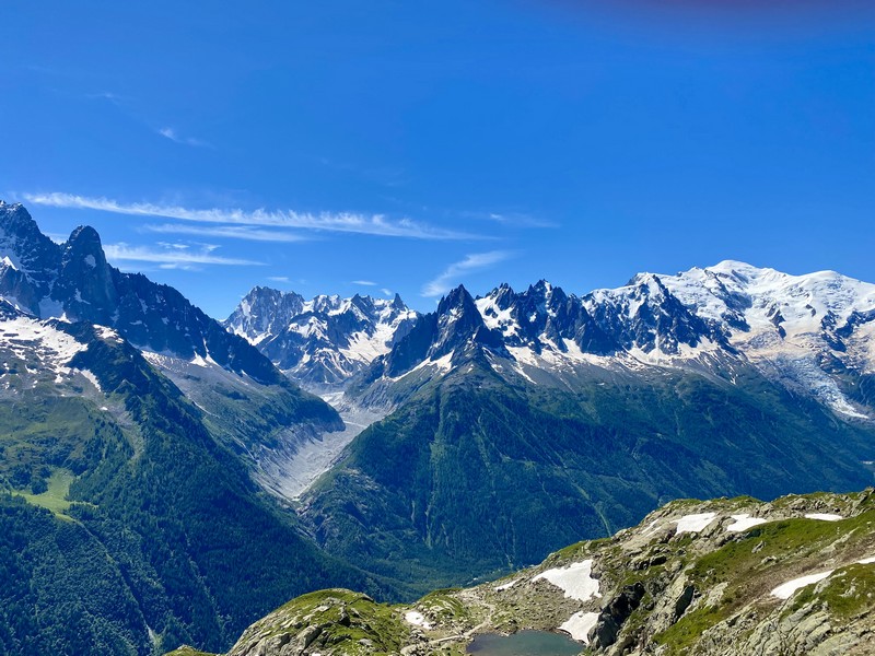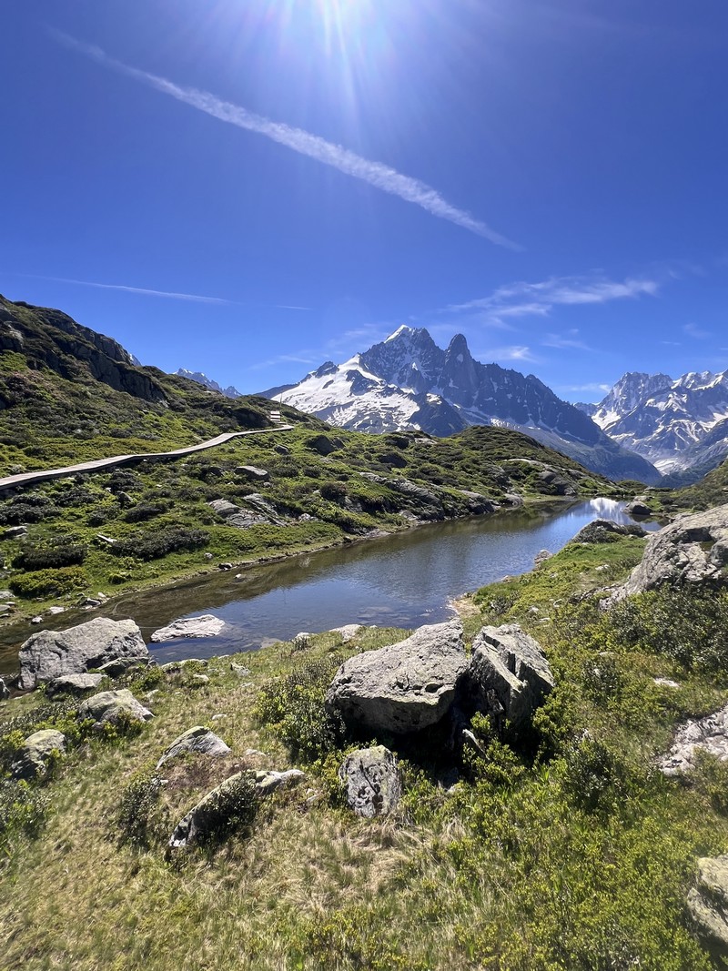 Il n'est pas rare de voir la partie la plus en retrait encore enneigée, même en plein été. Depuis ses rives, tu seras subjugué par un panorama époustouflant sur le massif du Mont-Blanc.