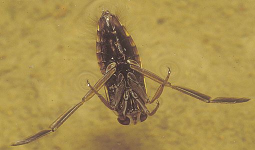 Notonecte Notonecta glauca, Notonectidae, Hétéroptère (corps de 15 mm de long) (Hamois, Condroz, Province de Namur, Belgique - 21/07/1994 - Diapositive originale réalisée par Eric Walravens). La troisième paire de pattes est transformée en rames efficaces chez cette punaise qui nage sur le dos.