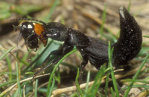 Staphylin odorant Ocypus olens, Staphylinidae, Coléoptère ayant capturé une coccinelle (corps de 26 mm de long) (Cap Gris-Nez, Région du Nord-Pas-de-Calais, France - 25/09/1994 - Diapositive originale réalisée par Eric Walravens). Remarquez les glandes odoriférantes répulsives à l'extrémité de l'abdomen.