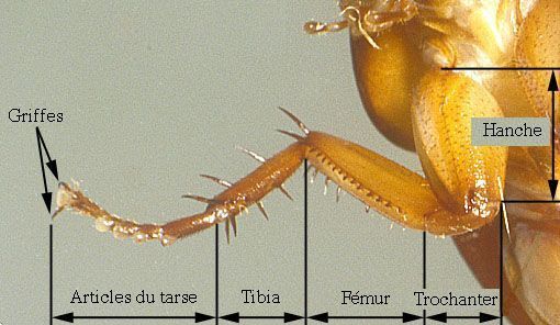Les pattes d'insectes sont faites d'un certain nombre de segments articulés. De la base vers l'apex, on reconnaît une hanche ou coxa qui s'articule avec le thorax, un petit trochanter, un long tibia, un long fémur et une série d'articles constituant le tarse, le dernier article étant pourvu de griffes ou autres structures adhérentes.