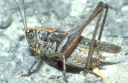 Imago mâle de decticelle chagrinée Platycleis albopunctata, Tettigoniidae, Orthoptère (Vallouise, Ecrins, France - 17/07/1990 - Diapositive originale réalisée par Eric Walravens). Remarquez les fémurs des pattes postérieures gonflés par la masse musculaire