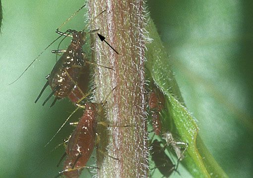 Pucerons, Aphidae, Homoptères sur une tige de Rumex (corps de 3 mm de long) (Inor, Département de la Meuse, Région de Lorraine, France - 11/06/2000 - Diapositive originale réalisée par Eric Walravens). La flèche désigne l'organe vulnérant, enfoncé dans la tige de la plante, et permettant d'aspirer la sève végétale.