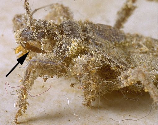 Larve de réduve masqué Reduvius personatus, Reduviidae, Hétéroptère (corps de 12 mm de long) (Maison à Hamois, Condroz, Province de Namur, Belgique - 13/03/1996 - Diapositive originale réalisée par Eric Walravens). La flèche désigne le rostre labial, replié ventralement, protégeant un fin stylet acéré (fait des mandibules et maxilles) grâce auquel il suce les proies animales.