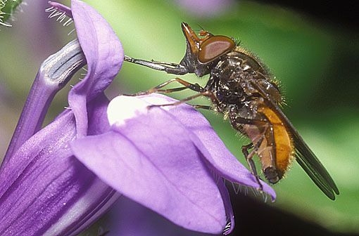 Rhingia campestris, Syrphidae, Diptère se nourrissant sur une fleur de Lobelia siphilitica (Hamois, Condroz, Province de Namur, Belgique - 26/08/1999 - Diapositive originale réalisée par Eric Walravens). Remarquez la trompe étendue.