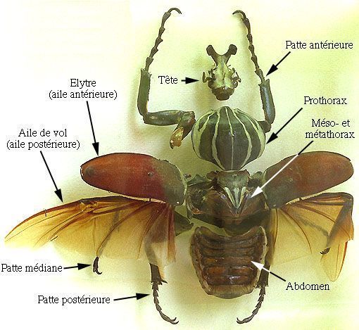Morphologie générale d'un insecte: le goliath Goliathus giganteus, Scarabaeidae, Coléoptère dont les différentes parties du corps ont été séparées (corps long de 11 cm) (Musée de Zoologie de l'Université de Liège - Diapositive du Musée de Zoologie de l'Université de Liège, complétée de légendes). Remarquez le reploiement complexe de l'aile de vol (à droite), qui lui permet, au repos, d'être complètement recouverte et protégée par l'élytre.