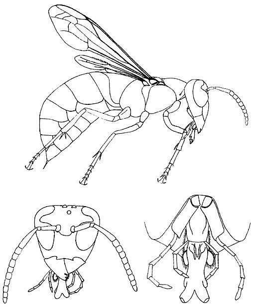 Dessins d'une guêpe Vespula species, Vespidae, Hyménoptère, de sa tête et de ses pièces buccales vues par dessous (dessin original réalisé par Eric Walravens).