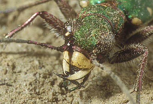 Tête de cicindèle champêtre Cicindela campestris, Cicindelidae, Coléoptère (Bomal (Durbuy), Condroz, Province de Luxembourg, Belgique - 16/04/1996 - Diapositive originale réalisée par Eric Walravens).
