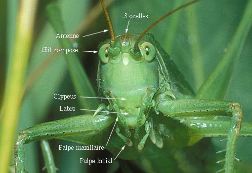 La tête des insectes provient de la fusion ancestrale de 6 segments primitifs, dont le premier porte les yeux, le deuxième les antennes, le troisième le labre, le quatrième les mandibules, le cinquième les maxilles ou mâchoires pourvues de palpes maxillaires, et le sixième le labium ou lèvre inférieure, pourvue des palpes labiaux. Outre de simples ocelles, la tête porte des yeux composés, faits de très nombreuses facettes ou ommatidies, et permettant une vision bien meilleure que chez les arachnides.