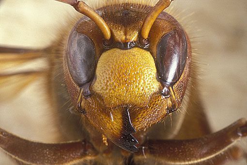 Tête de frelon Vespa crabro, Vespidae, Hyménoptère, montrant les puissantes mandibules dentées. (Hamois, Condroz, Province de Namur, Belgique - 07/05/1995 - Diapositive originale réalisée par Eric Walravens).