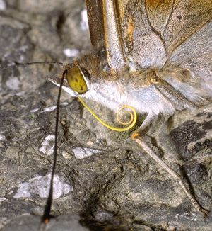 Trompe buccale (déroulement en cours) de grand mars changeant mâle Apatura iris, Nymphalidae, Lépidoptère (Rosée, Fagne, Province de Namur, Belgique - 07/07/1989 - Diapositive originale réalisée par Eric Walravens).