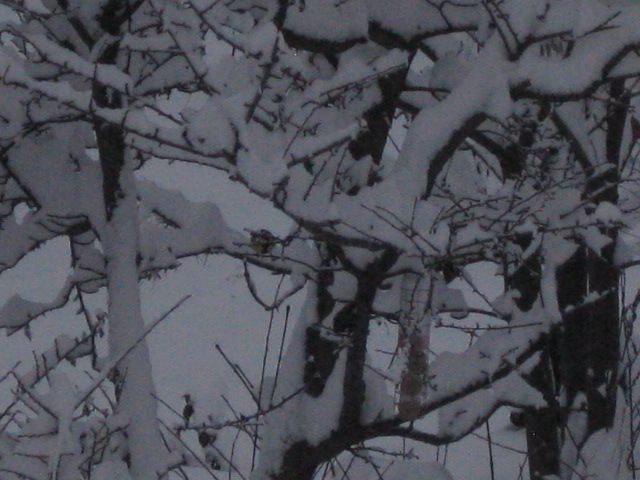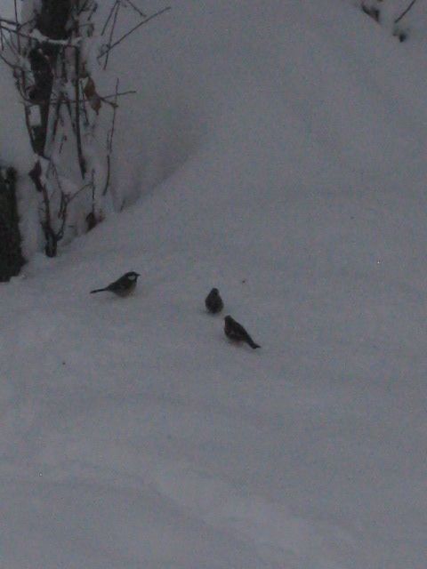 Elle appelle des renforts et de beaux moineaux arrivent et vont l'aider...Solidarité hivernale oblige...
